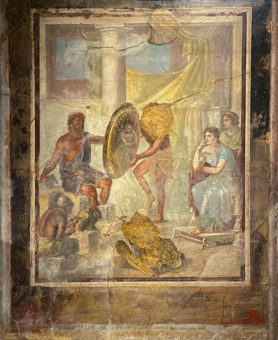 Σε αυτή την τοιχογραφία από την Πομπηία, ο Ήφαιστος αποκαλύπτει στη Θέτιδα τη νέα πανοπλία που έχει φτιάξει για τον γιο της, τον Αχιλλέα. Κοιτάξτε την αντανάκλασή της στην ασπίδα!